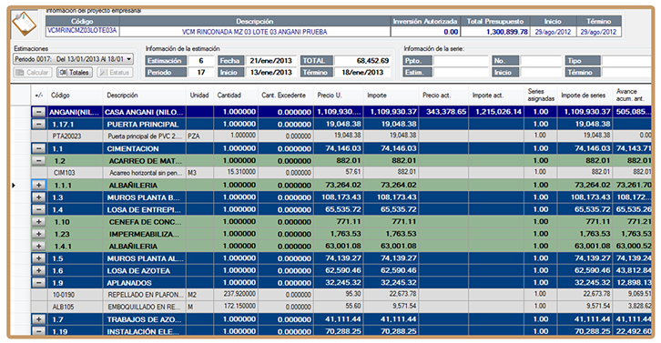 Administra las estimaciones a cliente de los proyectos en ejecución. Cada estimación esta ligada a un periodo de avance físico, por lo que para calcular su monto se realiza la valoración de los trabajos ejecutados en dicho periodo para cada actividad.
