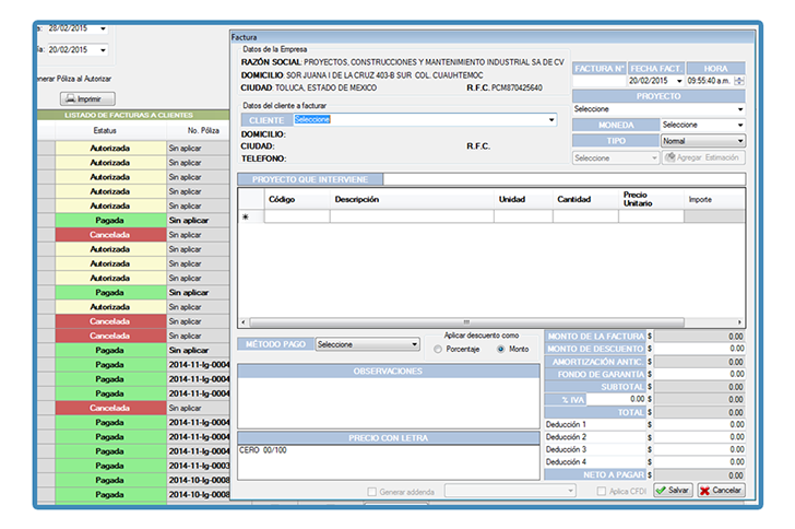 Crea una nueva factura para un cliente ya sea de manera manual o por una estimación del proyecto, adicionalmente puede crear una factura electrónica con rfácil - Grupo rfácil Empresarial S.A. de C.V. Es posible generar la póliza de manera automática para la factura desde este módulo.