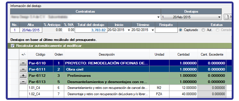 En esta interfaz se asignan actividades a subcontratistas o destajistas y se administran los subcontratos. el subcontrato es la asiganción de trabajos del proyecto a un tercero, que es llamado subcontratista.