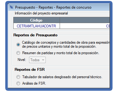 Muestra, imprime y exporta los reportes que se requiere que presenten los participantes, como parte de la propuesta en concursos de licitaciones de obra pública.
