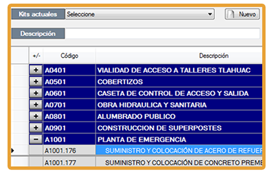Adicionalmente se puede realizar la definición de los Kits que se utilizarán en el armado de los conceptos y partidas del presupuesto de obra que se genera para la ejecución del proyecto.